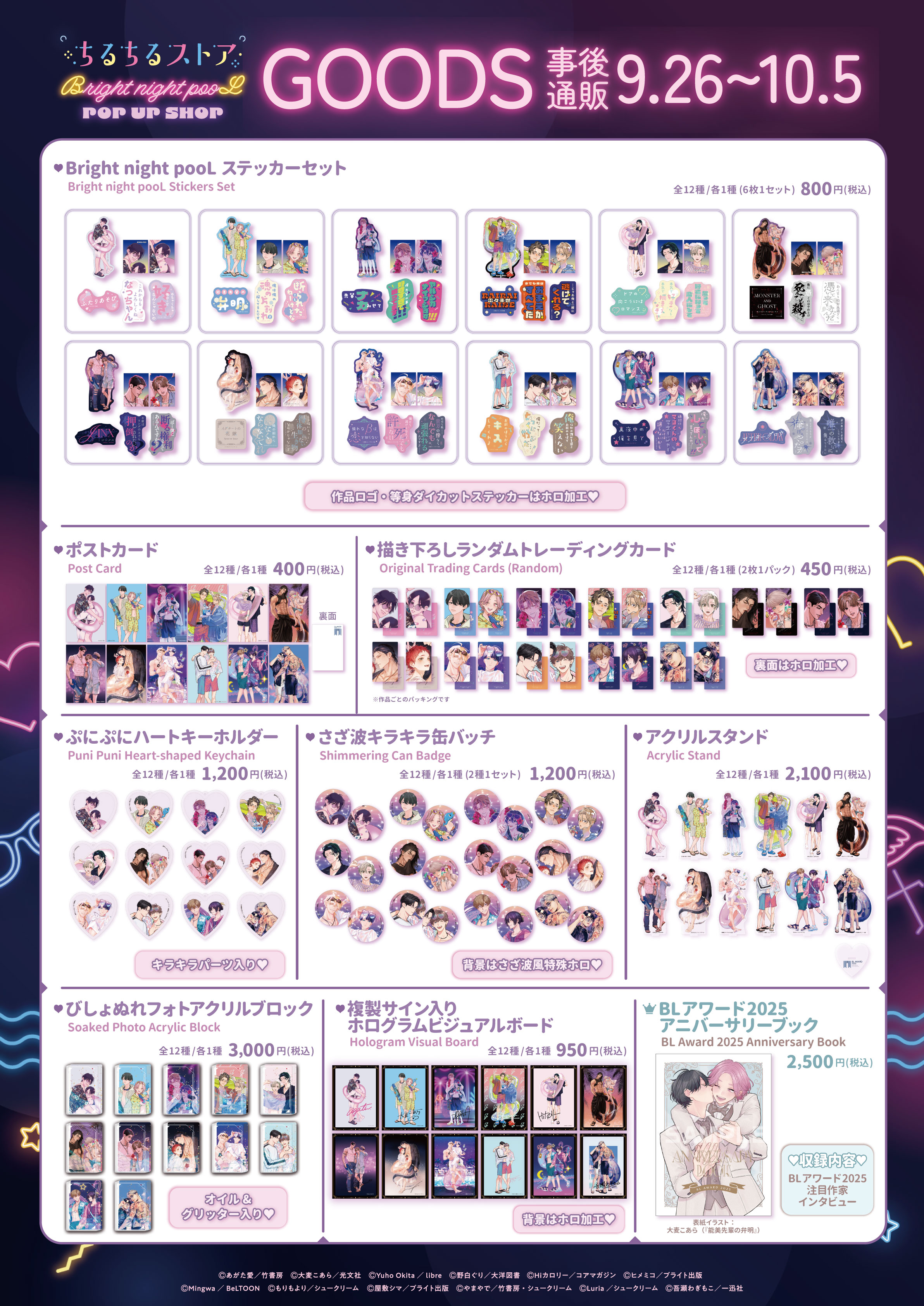 渋谷モディとなんばマルイにて開催され、大盛況のうちに幕を閉じたポップアップストア『ちるちるストア ~Bright night pooL~』。追加販売された「Bright night pooLステッカーセット」を含む、BLアワード2025記念グッズを事後通販でも販売いたします!