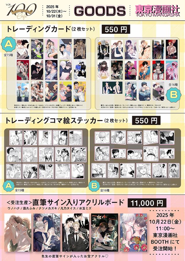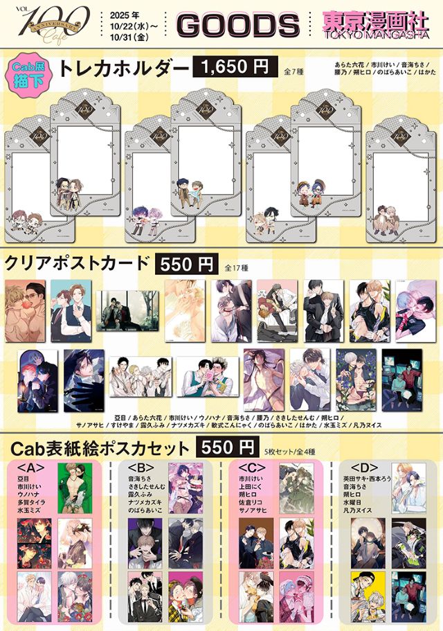 東京漫画社のBLアンソロジー『Cab』が、10月28日発売号でついに100号を達成! それを記念したコラボカフェ「Cab Vol.100 Anniversary Cafe」が、ソフマップステラカフェにて10月22日(水)~11月9日(日)に開催されます! 現在ステラマップカフェ公式HPで、コラボカフェ予約受付中です♪
