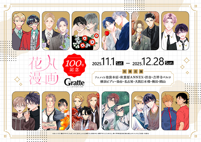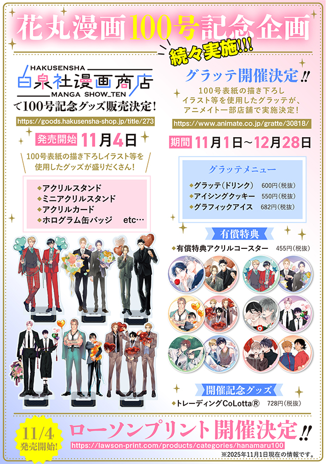 電子雑誌『花丸漫画』vol.100を11月1日(土)に一部電子書店にて先行配信。100号の配信を記念し、白泉社の公式ショップでの記念グッズ販売や、Gratteコラボ、ローソンプリントなどお祝い企画盛りだくさんです!