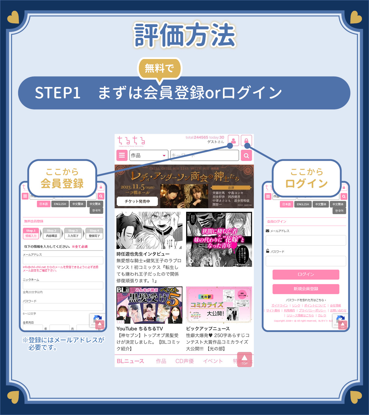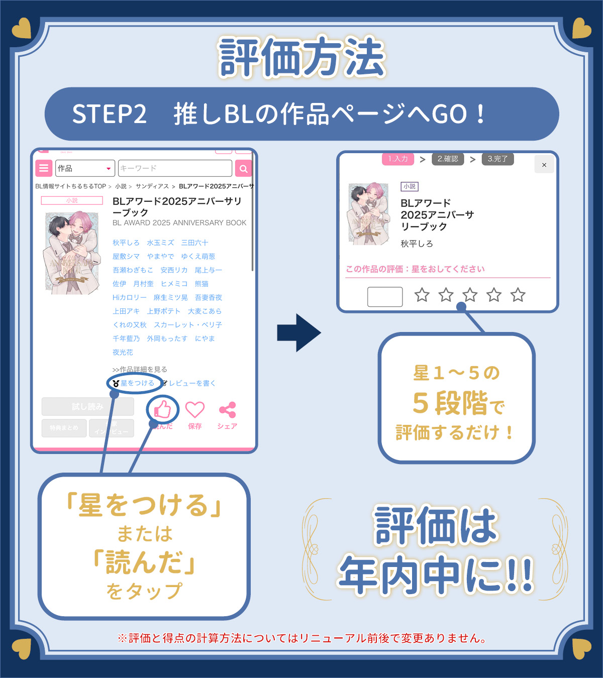 実はBLアワードのノミネートにおいて、ちるちるでの評価得点は非常に重要な選考要素の一つって知っていましたか?つまり、“ちるちるで評価ボタンを押すだけ”でノミネートの後押しになるんです!!