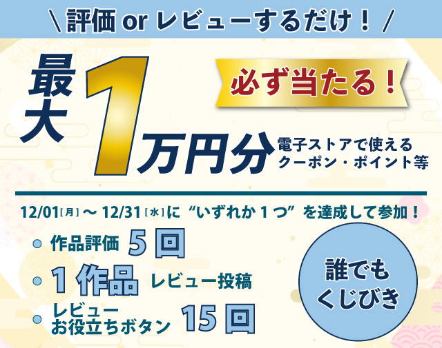推し作品を評価&レビューするだけで、最大1万円分の電子ストアクーポンやポイント、ギフト券がかならずもらえる、年末のビッグキャンペーンが今年もやってきます!!!